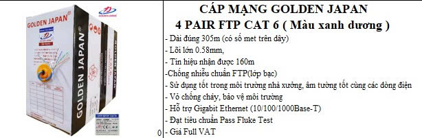 Cáp Mạng FTP Cat6 Golden Japan 305m Xanh Dương