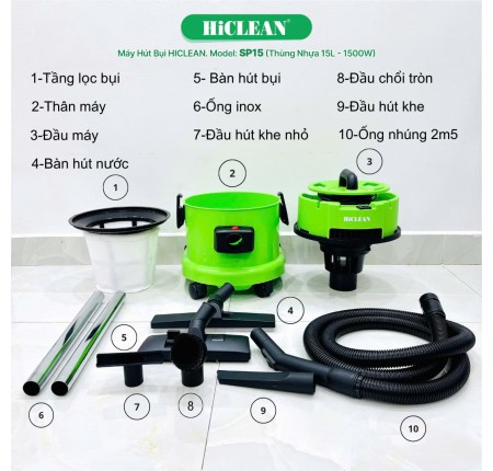 - Máy hút bụi gia đình HiClean SP15 có khả năng hút nước và hút khô cùng các bụi bẩn một cách nhanh chóng, mang lại hiệu quả cao.