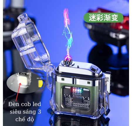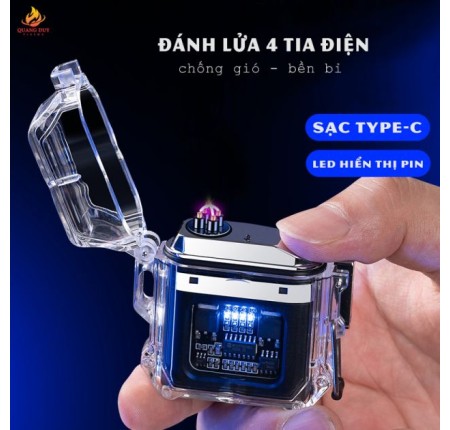 Quẹt Lửa 4 Tia Plasma Trong Suốt Sạc USB Đèn COB