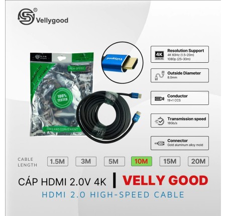 Cáp HDMI VellyGood 10m (2.0v 4K/8.0mm/19+1)